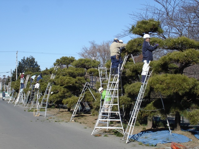 | 深谷市の花植木流通センターにあるクロマツをもみあげ剪定しているところです。 平菊会という熊谷高等専門技術校の造園科卒業生を主とした仲間の集まりです。 年に2回クロマツの剪定の講習会があり、今回は1月にありました。 |