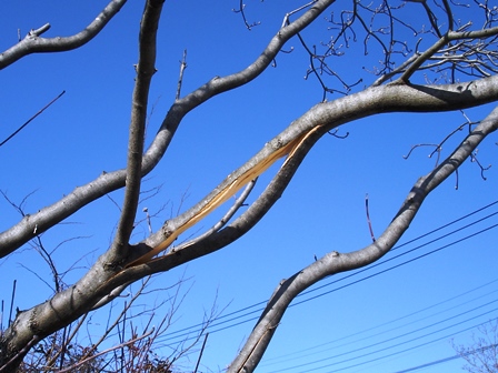 | 大雪の後、ハナミズキの枝が縦に半分(上下)に割れていた。他のハナミズキにもこうした現象があった(神川町健康緑道)。 |